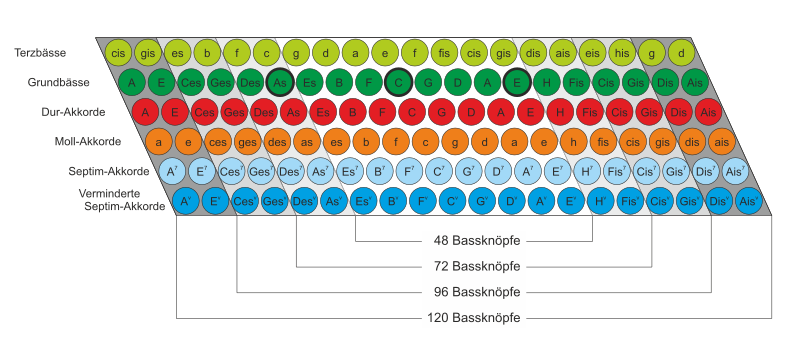 Bei einem 48-Bass Akkordeon sind im Prinzip alle Tonarten verfügbar, es fehlen allerdings die Septime- und verminderte Septime-Reihe. Ein 72-Bass Akkordeon ist insoweit vollständig. Um den Wechsel der äußeren Akkorde von oben nach unten zu erleichtern, werden bei den größeren Instrumenten die Akkorde einfach wiederholt (wobei Fis-Dur = Ges-Dur ist, Cis-Dur = Des-Dur usw.)